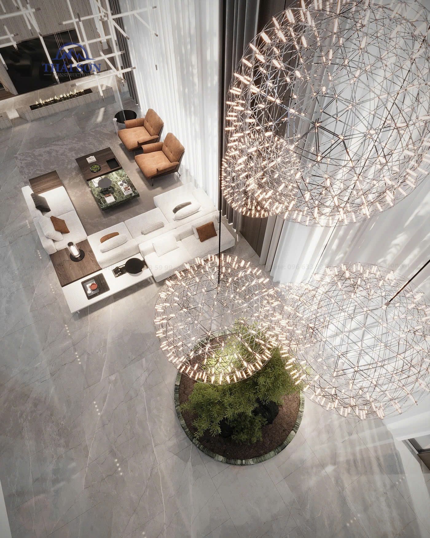 Những cụm đèn thả nghệ thuật lơ lửng giữa không trung, đan xen theo nhịp điệu thị giác, tựa như các dải sáng chuyển động. Ánh sáng rót xuống nhẹ nhàng, tôn vinh toàn bộ không gian bằng sự sang trọng đầy tinh luyện.