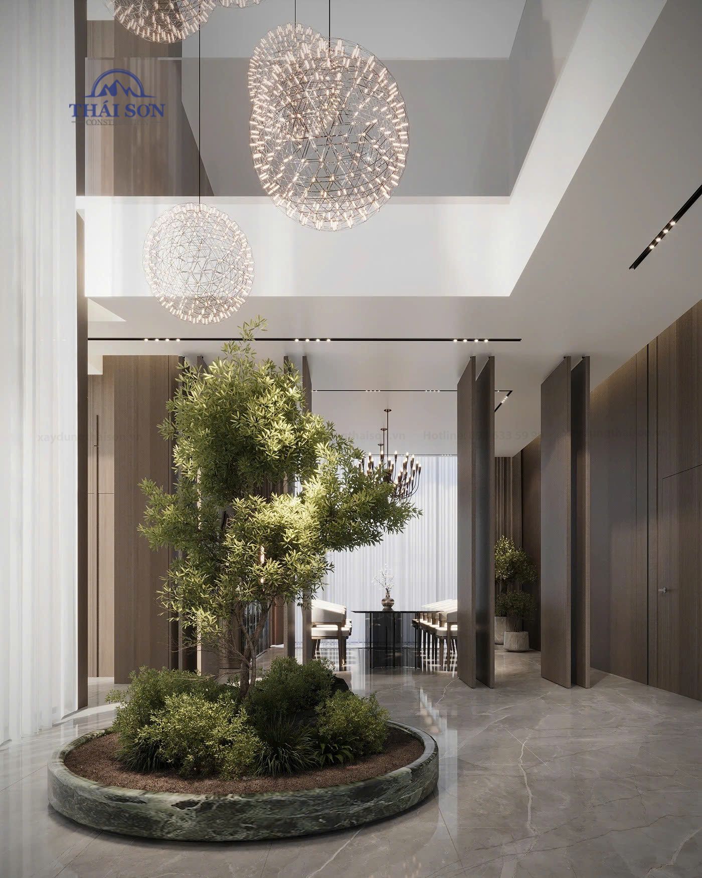 Cây xanh đặt giữa không gian như “linh hồn” của thiết kế — đưa thiên nhiên bước vào cuộc sống, cân bằng giữa tính hiện đại và hơi thở sinh thái.
