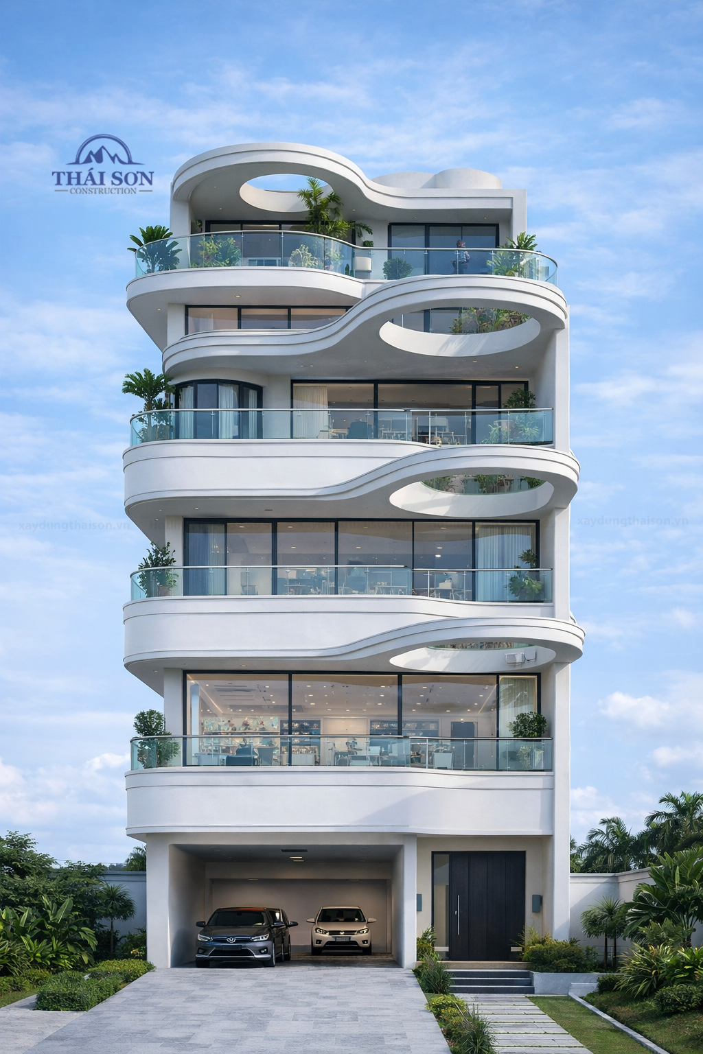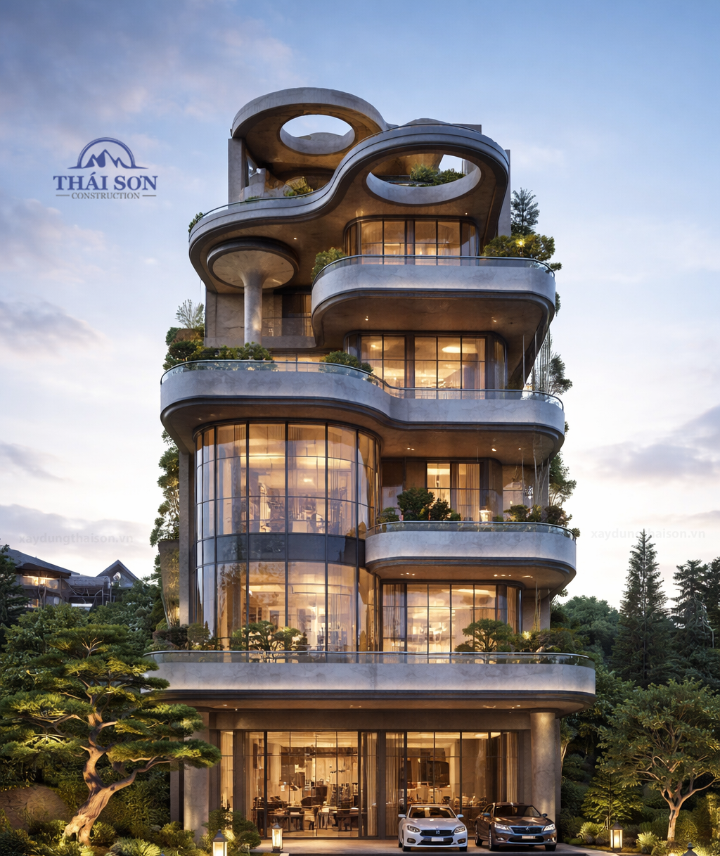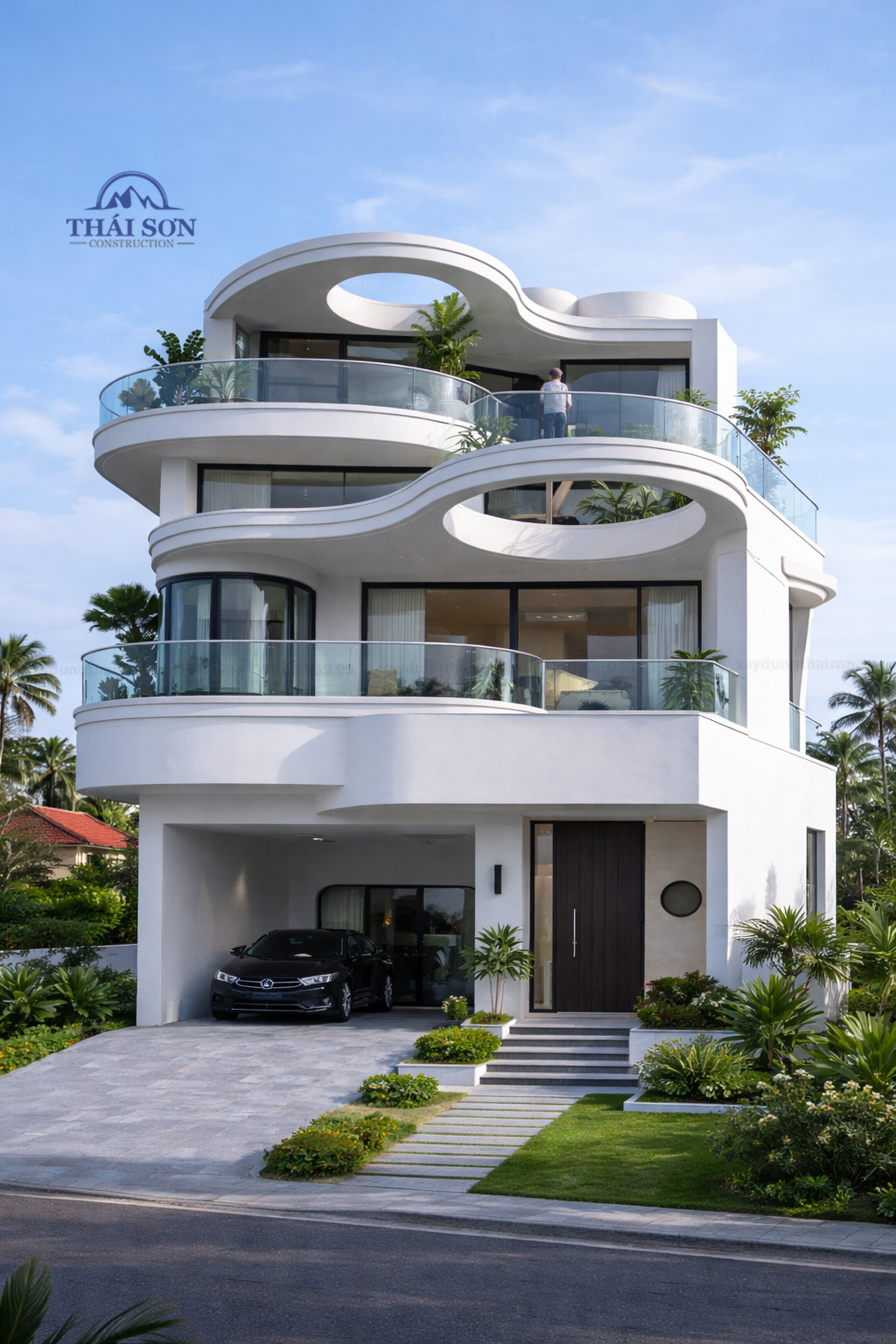 Thị hiếu của khách hàng các công trình của Tổng thầu xây dựng Thái Sơn những năm gần đây, biệt thự hiện đại 3 tầng kết hợp đường cong đang trở thành xu hướng thiết kế nổi bật, mang đến diện mạo mới mẻ cho không gian sống cao cấp. Công trình không chỉ gây ấn tượng bởi hình khối kiến trúc mềm mại mà còn tạo ra trải nghiệm sống khác biệt, tinh tế và giàu cảm xúc.