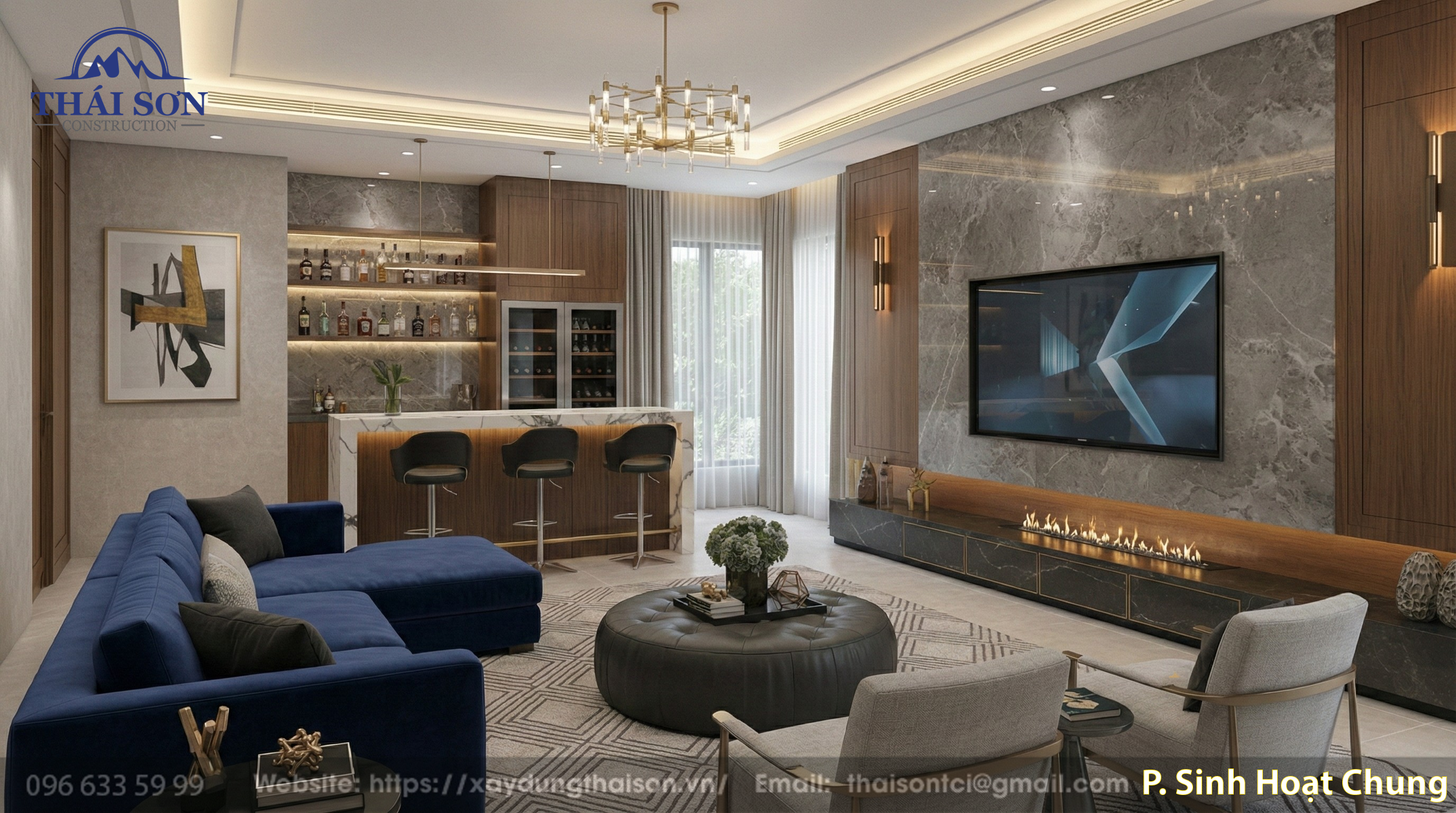 Phòng sinh hoạt chung có quầy ba thư giãn