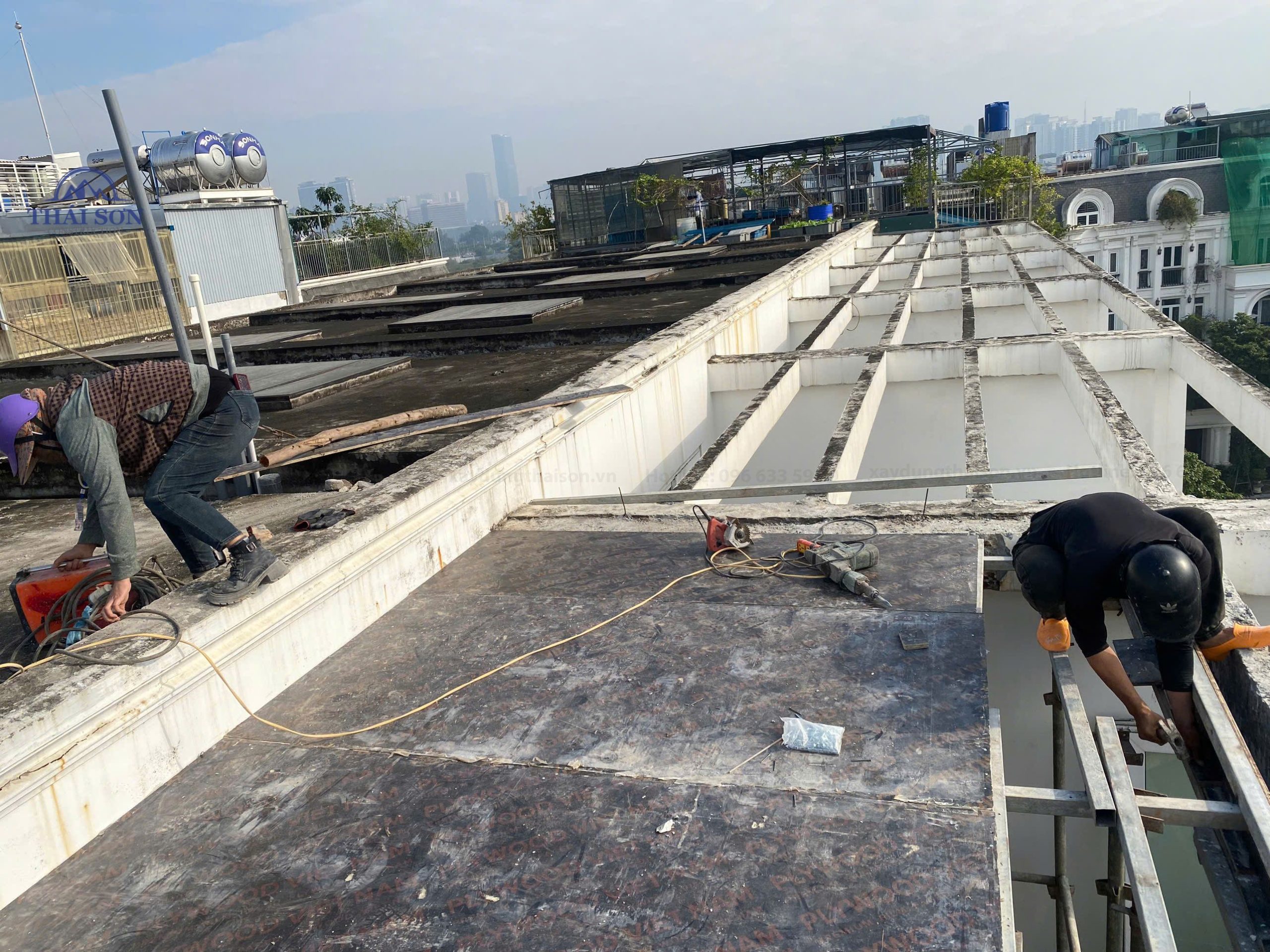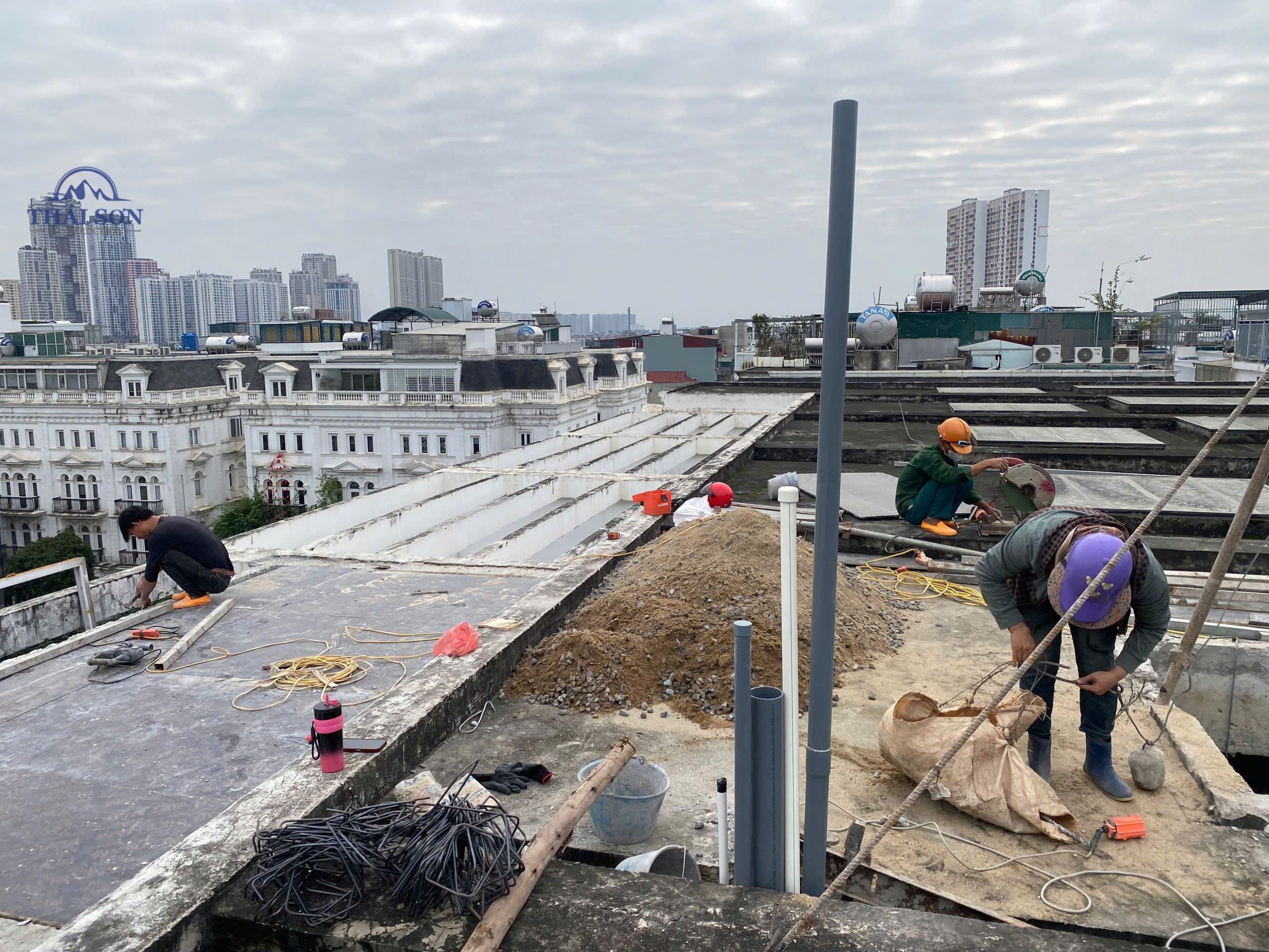 Trong suốt quá trình thi công, công tác an toàn lao động được đặt lên hàng đầu. Hệ giàn giáo, lan can bảo vệ và lối di chuyển được bố trí đầy đủ, đảm bảo điều kiện làm việc an toàn cho công nhân trên cao. Kỹ sư giám sát luôn túc trực tại hiện trường để kịp thời xử lý các tình huống phát sinh, đảm bảo tiến độ và chất lượng thi công theo đúng kế hoạch.