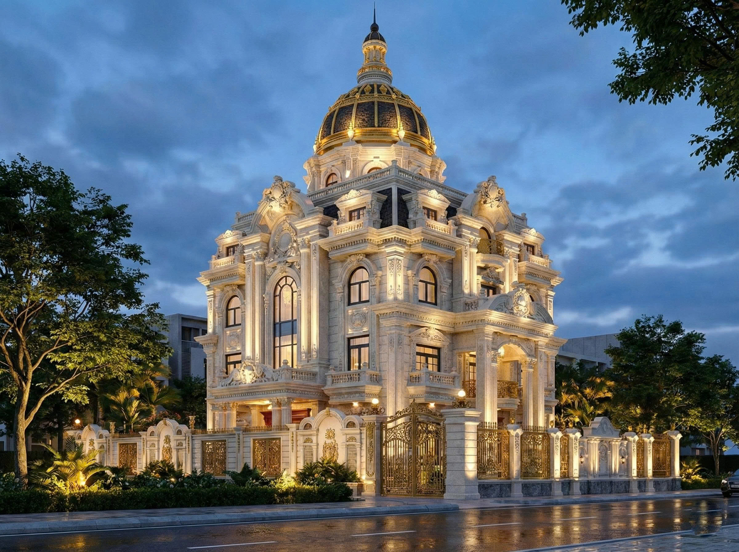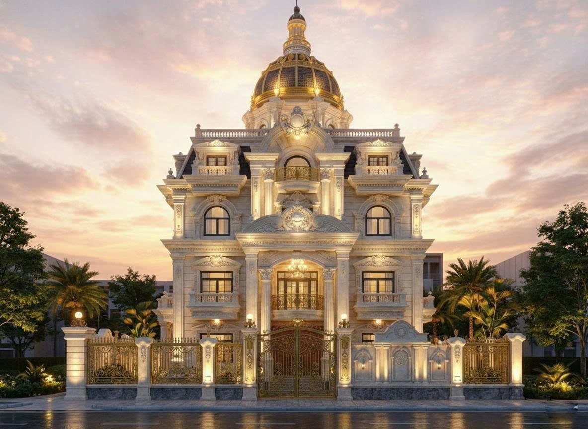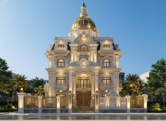 Siêu biệt thự với bố cục đăng đối chuẩn mực, từng khối kiến trúc được sắp đặt theo tỷ lệ vàng, khiến tổng thể trở nên hài hòa, cân xứng và mạnh mẽ. Điểm nhấn lớn nhất chính là vòm mái hoàng gia dát ánh kim, biểu trưng cho quyền lực và sự sang trọng tuyệt đối. Hệ mái vòm cao vút không chỉ tạo sự uy nghi mà còn mang lại hình ảnh đặc trưng của những cung điện Pháp – Ý thời kỳ Phục Hưng.