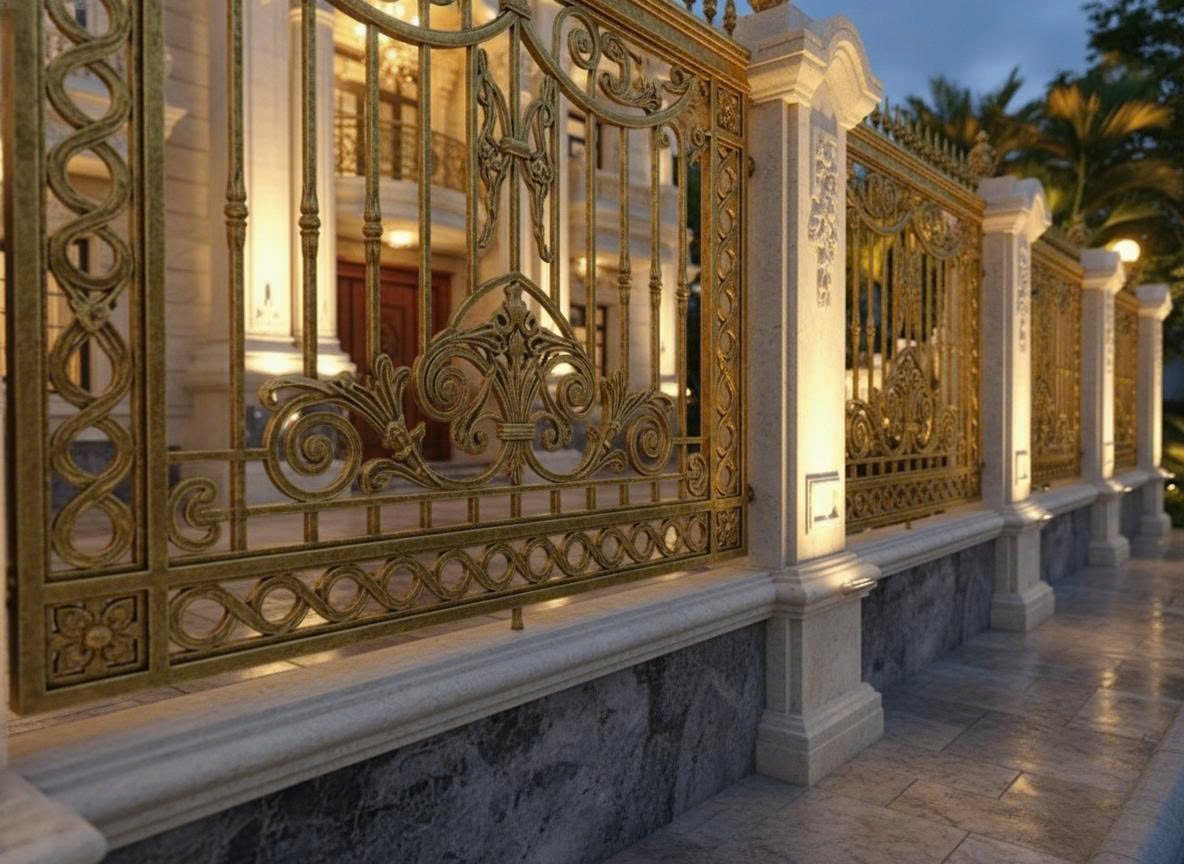 - Lan can sắt nghệ thuật hoa văn dát ánh vàng, sang trọng đặc biệt