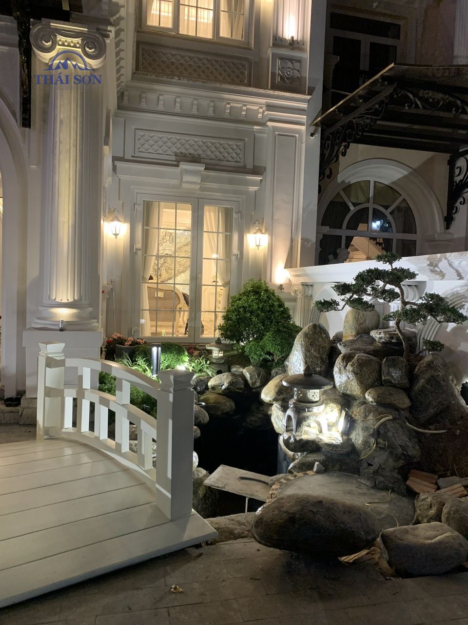 Điểm nhấn đặc biệt nằm ở không gian phía trước nhà. Một hồ cá mini kết hợp hòn non bộ được bố trí hài hòa, vừa tạo cảnh quan mềm mại, vừa mang yếu tố phong thủy. Từ cổng bước vào, lối cầu thang dẫn khách lên nhà được thiết kế cân đối, khiến mỗi bước chân như chậm lại để cảm nhận trọn vẹn vẻ đẹp của ngôi biệt thự.