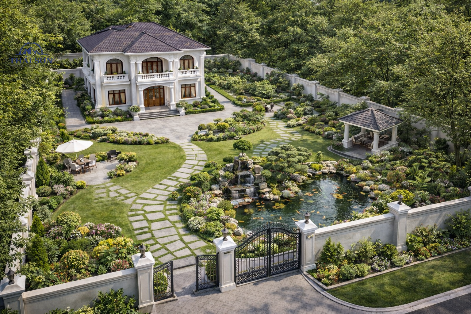- Hạng mục cảnh quan: Sân vườn xanh, hồ cá, chòi nghỉ, khu vực ngồi thư giãn ngoài trời