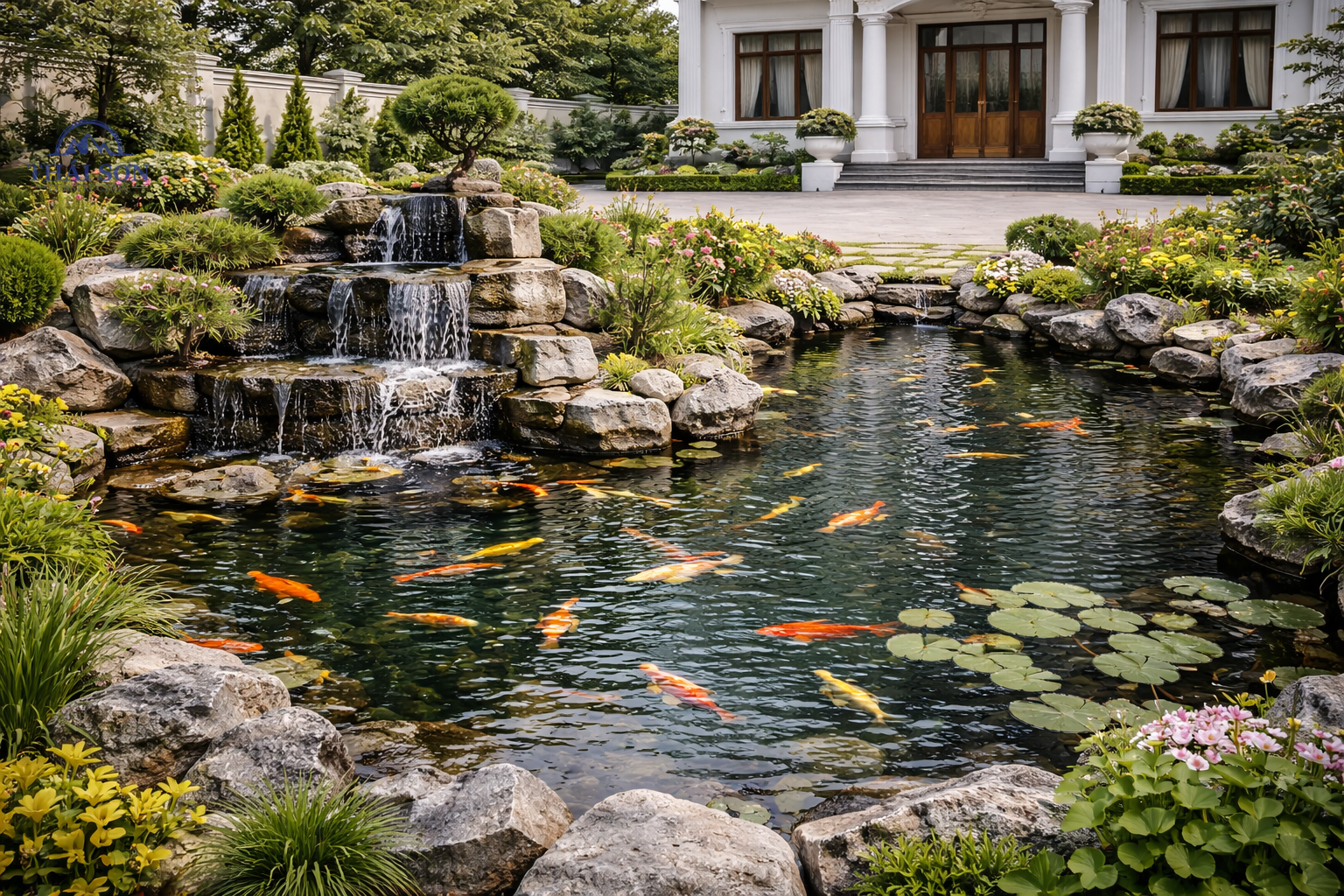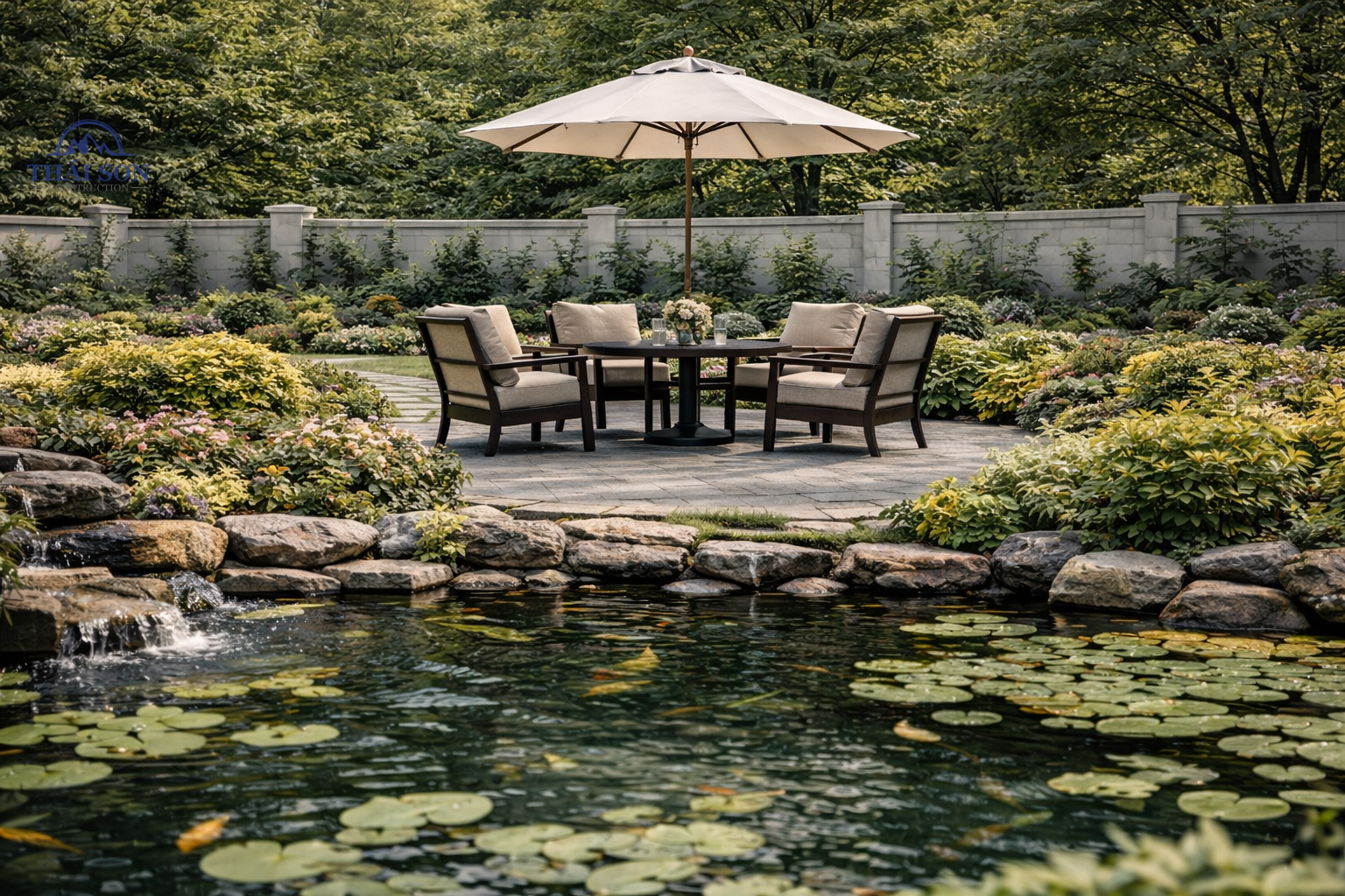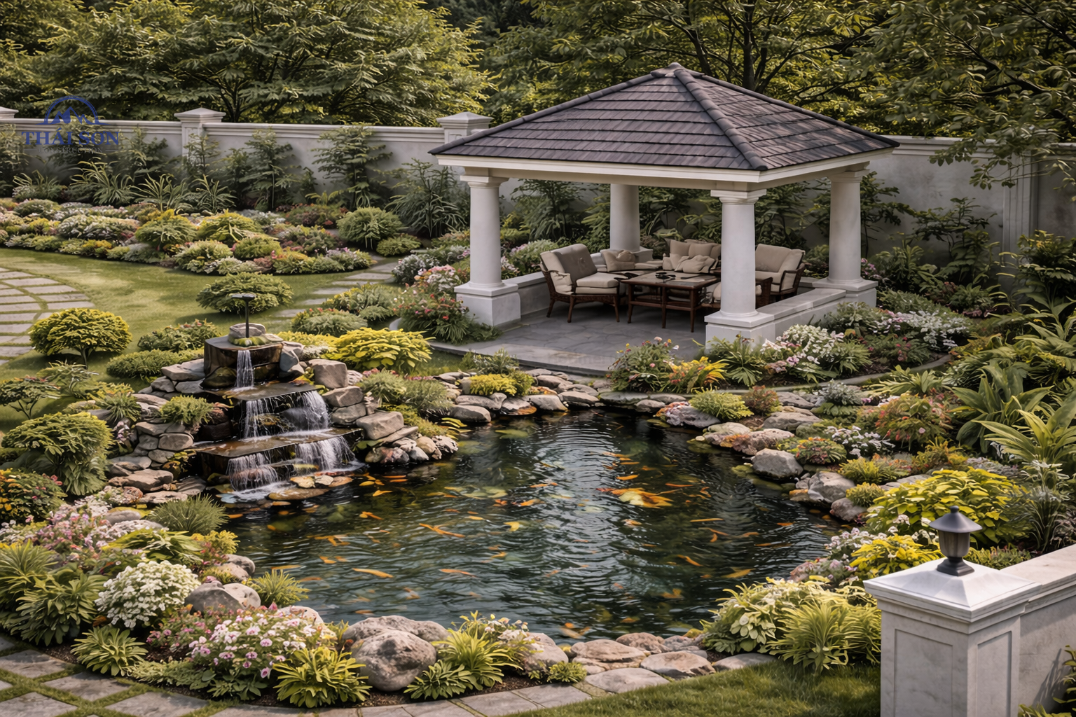 - Bố trí hồ cá, thác nước, chòi nghỉ